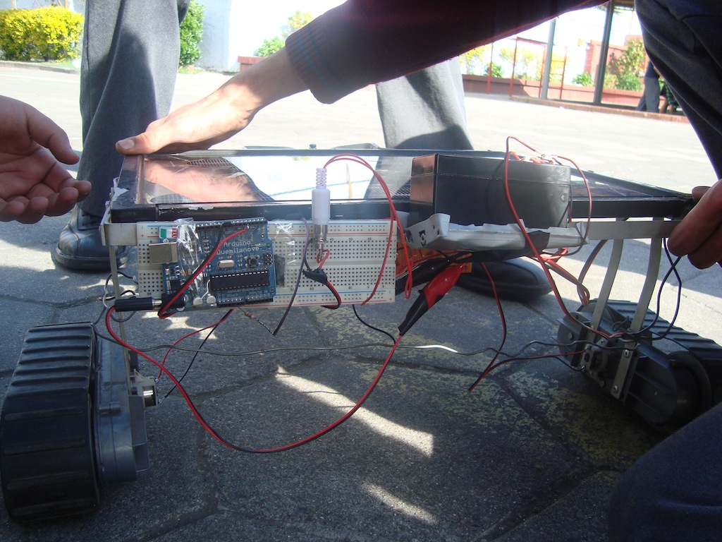 Estoy totalmente orgulloso del equipo de robótica de mi colegio. En el taller que yo fundé (si, mandé cartas y me moví para que hubiera un taller en mi colegio). Hoy hicimos funcionar el ardu-auto (al menos así le llamo yo, todavía no lo bautizamos). Un proyecto de auto-robót-loquesea, controlado por Arduino. Usa energía solar y la idea es que a futuro haga muchas más cosas de las que ya hace.